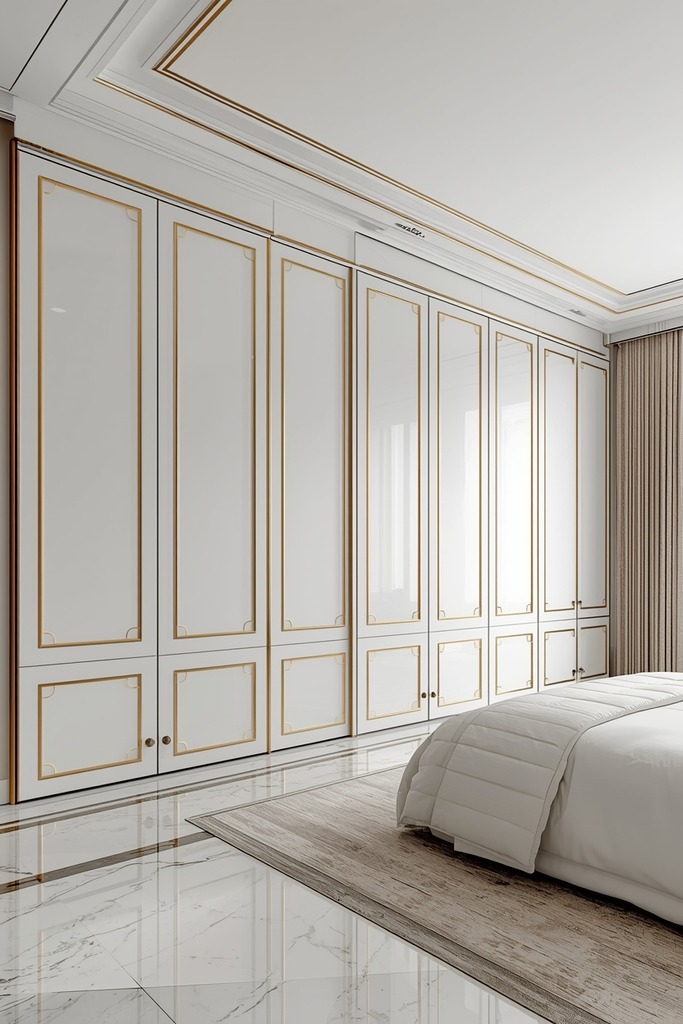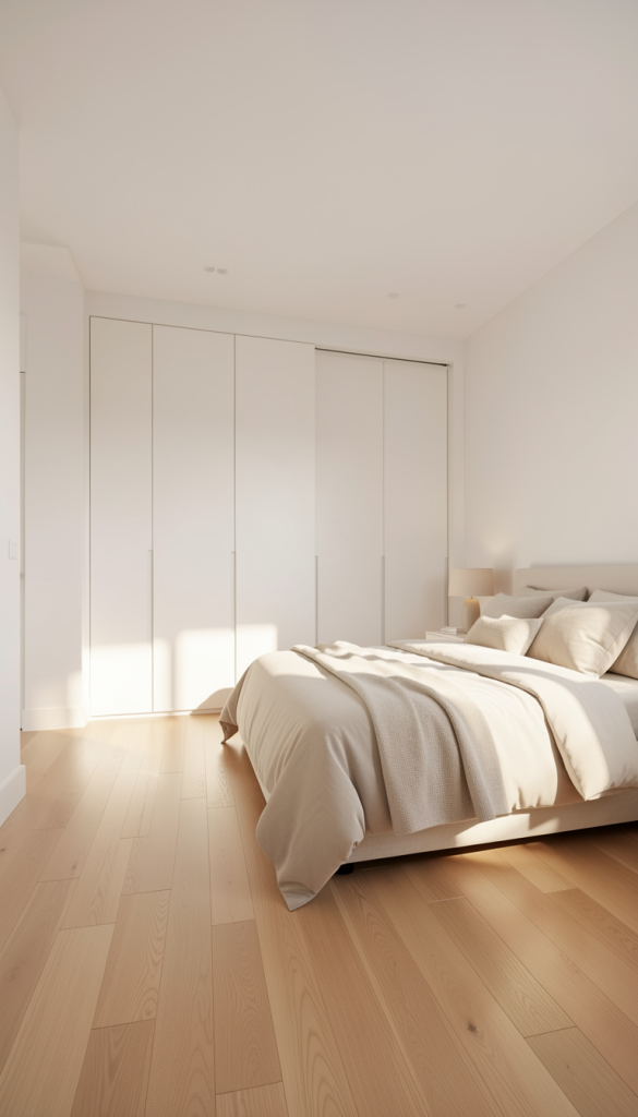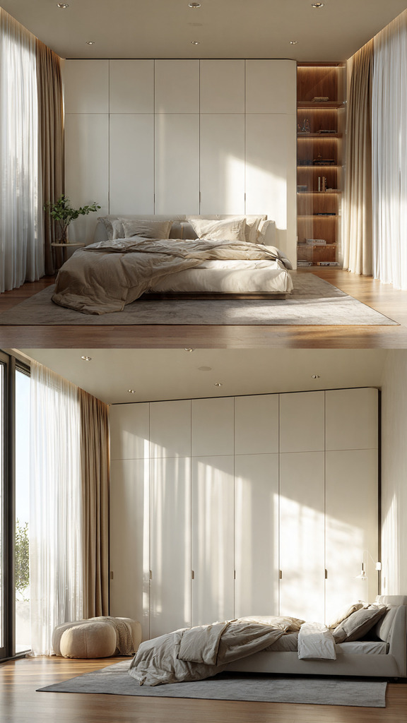 Modern sliding door wardrobes with minimalist interior design often have handleless doors and push to open mechanisms. These smooth, flat surfaces in whites, grays, or natural wood tones blend well with bedroom walls. This design choice eliminates visual clutter and creates an illusion of continuous wall space. It makes your bedroom feel more open and airy.