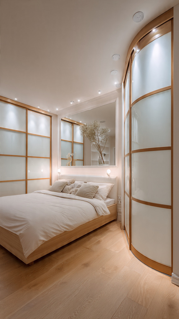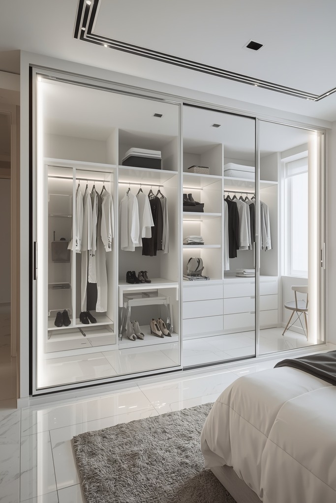 Choosing the right finish is key. Mirrored panels reflect light, making the space seem bigger. Frosted glass lets in natural light while softening the area. Your wardrobe should match your bedroom’s style, making it a statement piece.