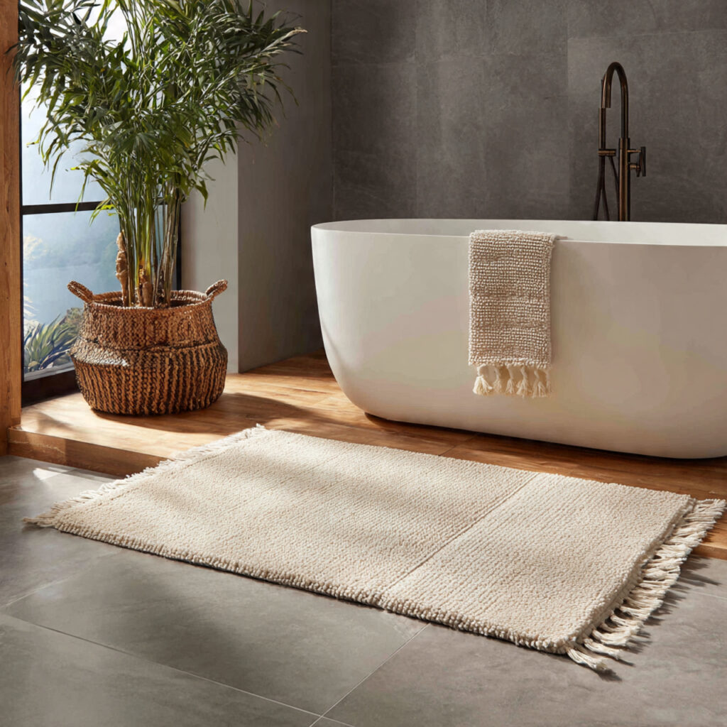 Wood look tiles offer a warm, natural aesthetic. To complement them, choose a rug that enhances the wood tones. A rug with earthy tones such as beige, brown, or taupe can create a harmonious bathroom environment.
