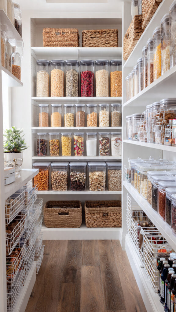 Use washable liners and clear bins for order. Regular cleaning keeps the pantry tidy.