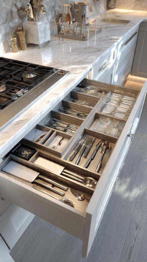 I use a simple drawer plan to keep things organized. I use silverware trays, adjustable dividers, and utensil bins. Knife blocks and small-part trays prevent clutter.