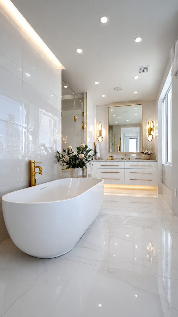 Designing a luxury bathroom is all about the finish. It shapes the look and feel of the space. Glossy tiles make the room bright and airy, ideal for modern designs.