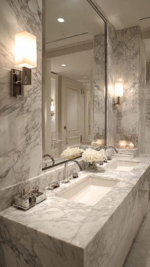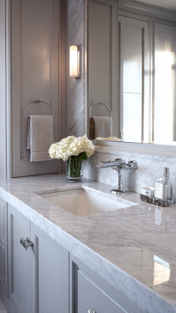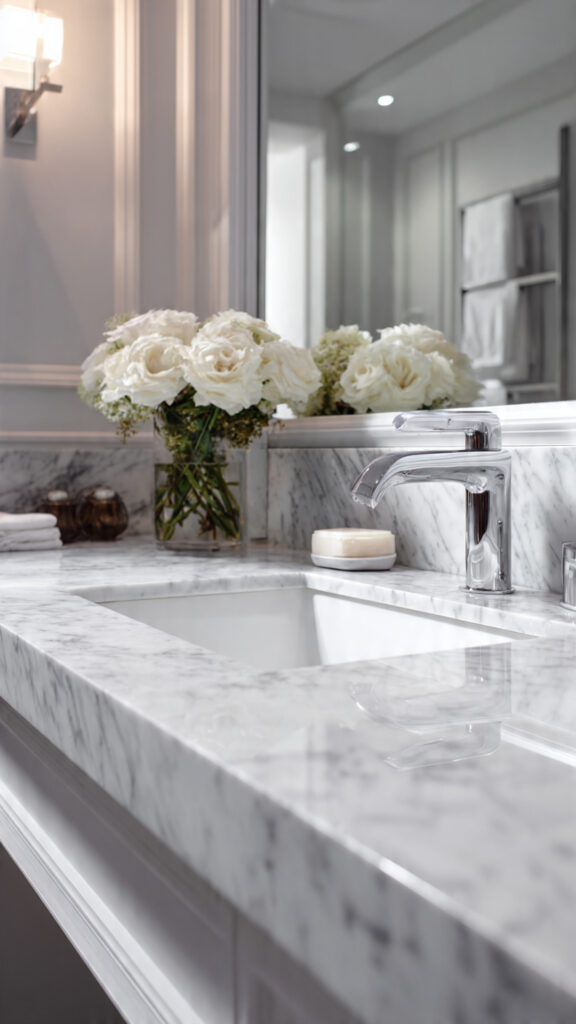 A high-end, professional photograph of a luxury bathroom featuring a white marble integrated sink countertop with elegant grey veining, minimalist chrome fixtures, and soft ambient lighting reflecting off a polished surface.