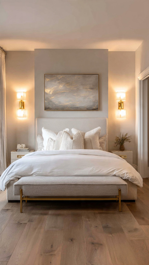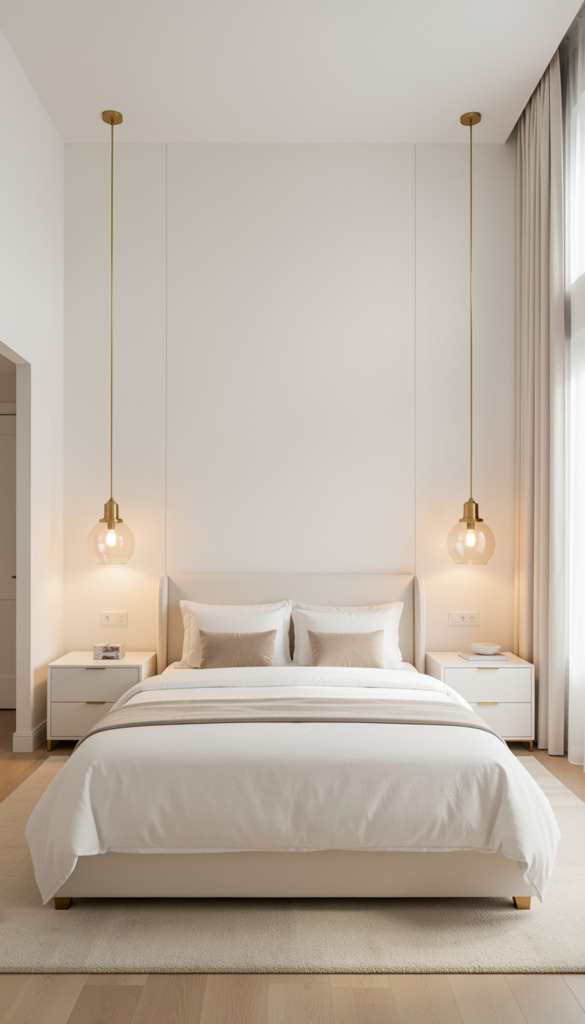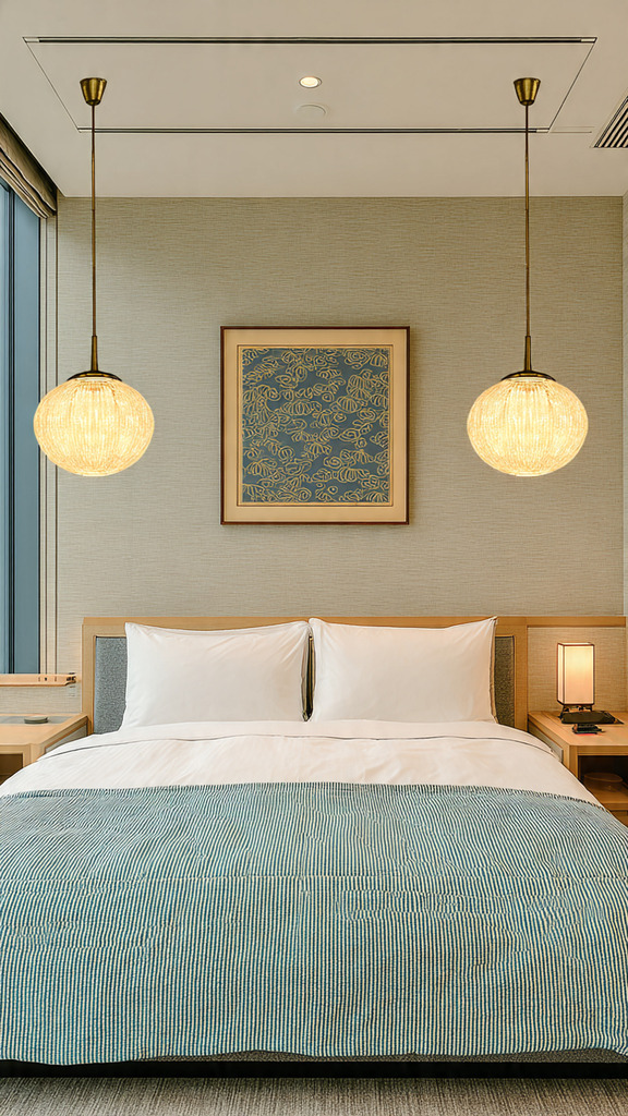 Lighting symmetry is key. Matching lights on both sides of your bed brings balance. For a unique touch, try asymmetrical designs. Metal finishes like brass and rose gold match your room’s decor.