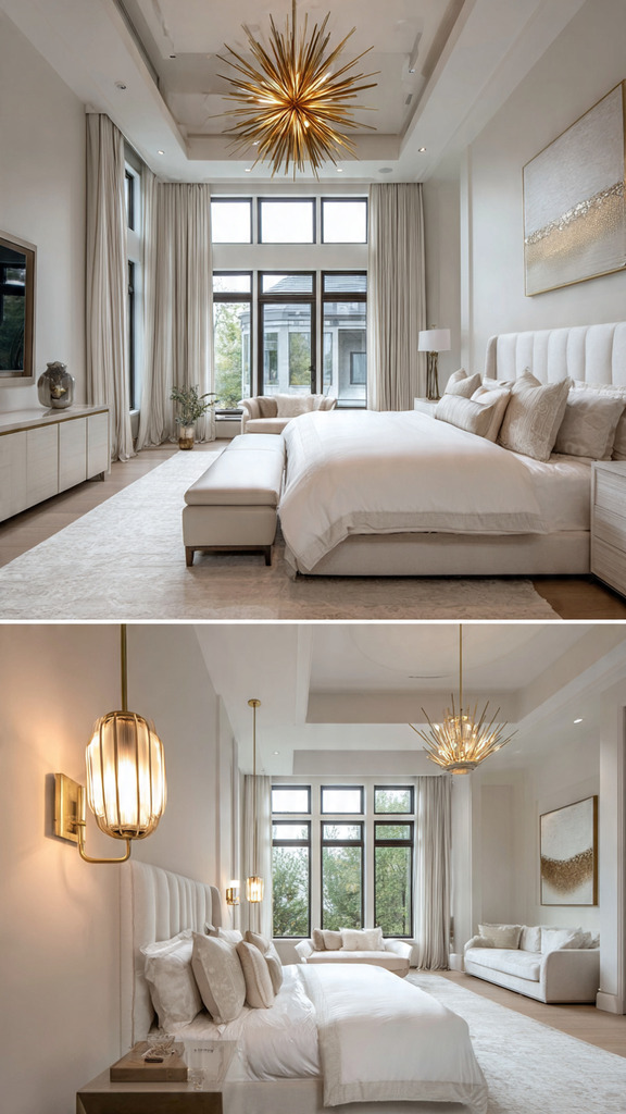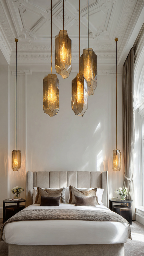 Using both pendant lights and sconces adds depth to your lighting. You can have pendant lights over nightstands and sconces for wall lighting. This mix, as shown in modern crystal chandelier design principles, enhances your room’s look.