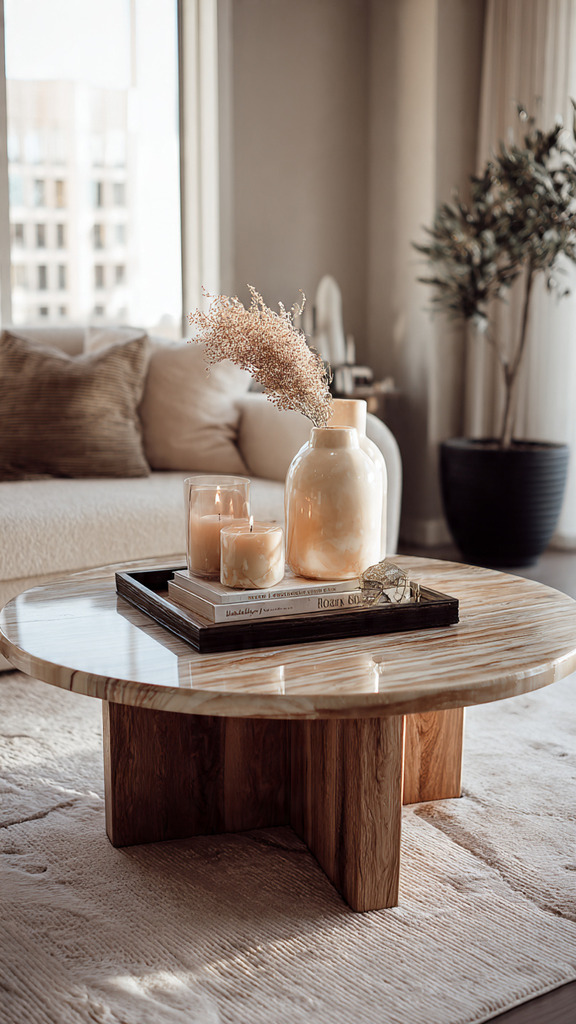 For round coffee tables, a centerpiece or vase can be a great focal point. The round shape lets you arrange items smoothly around it, creating a balanced look. Adding a few favorite books or a small tray can also add interest.