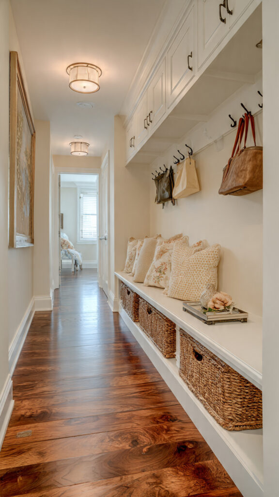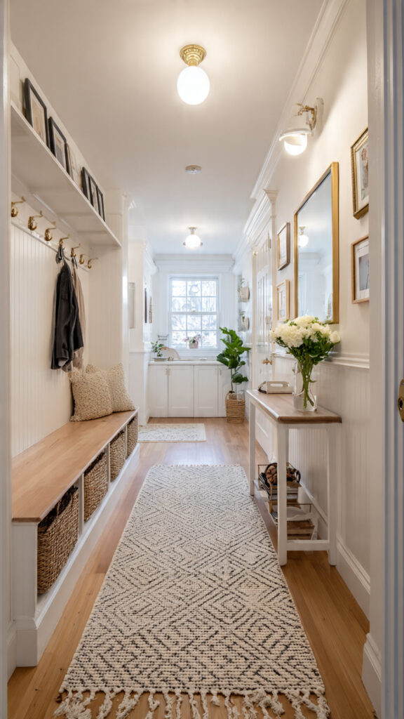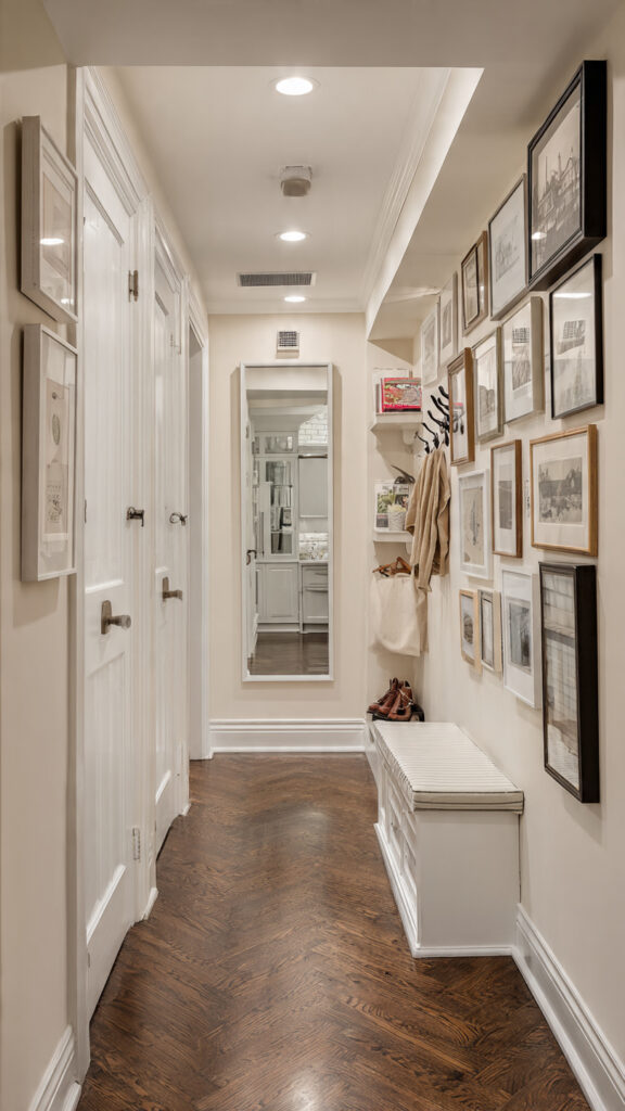These ideas aren’t just for entryways. They work for long narrow kitchens and other tricky spaces too. Think of your narrow hallway as a blank canvas for creative solutions.
