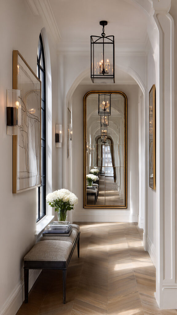 Functionality meets beauty at every turn. The large statement mirror amplifies light and makes the hallway feel twice as wide. Strategic lighting layers ensure the space is inviting at any hour.